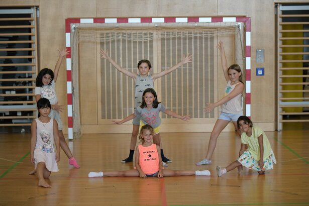Zum täglichen Trainingsprogramm gehören ein Warm Up und Dehnübungen. Bei der Tanztechnik werden Sprünge, Drehungen und Balance trainiert. Natürlich muss auch die Choreografie einstudiert werden, damit beim großen Auftritt am Freitag alles klappt. Hier fließen Ideen aus den Bereichen Modern, Ballet, Jazz Dance, Cheerdance und Hip Hop ein. Wer will, kann auch ein kurzes Solo erarbeiten und einstudieren.